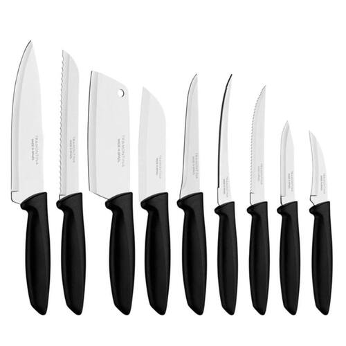 Com o jogo de facas tramontina plenus com lâminas em aço inox e cabos de polipropileno preto 9 peças, você terá a solução completa de facas para utilizar nos mais diversos tipos de cortes e ocasiões gastronômicas. As peças combinam com qualquer cozinha e a deixam mais bonita e clássica, pois seus cabos são na elegante cor preta. As lâminas produzidas em aço inox por terem sido submetidas a tratamento térmico, oferecem maior durabilidade e resistência. As facas são fáceis de limpar e podem ser lavadas na máquina de lavar louças. Com peças únicas e de muita importância na cozinha, o jogo de facas é a escolha perfeita para você. Facas de qualidade e beleza você encontra com a tramontina