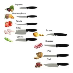 O Conjunto Contém: -faca para Tornear 3' -faca para Legumes 3' -faca para Churrasco / Frutas 5' -faca para Tomate 5' -faca para Desossar 5' -faca Santoku 5' -cutelo 5' -faca para Pão 7' -faca Chef 7'