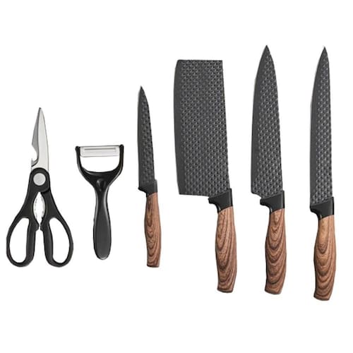 Conjunto de utensílios completo para diferentes tipos de alimentos, desde carnes, até vegetais e frutas, produzidos com controle de qualidade Kehome. As facas e cutelo, possuem lâmina com camada antiaderente, além de ondulações que não retém alimentos e facilita a limpeza. Também possui cabo anatômico e texturizado, dando um requinte a mais ao layout geral de cada peça, o acabamento metálico entre a lâmina e o cabo ajuda a proteger seu dedos do contato direto com a lâmina.