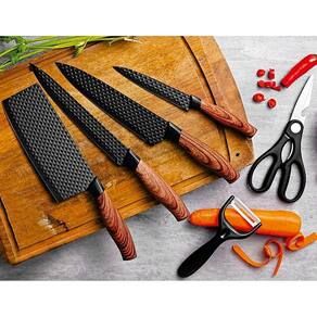 CONTEUDO DO KIT 01 Faca de Cozinha 20,32cm lâmina e 33cm total 01 Faca do Chef 20,32cm lâmina e 33cm total 01 Cutelo 17,78cm lâmina e 30,5cm total 01 Faca de Legumes 12,7cm lâmina e 24,5cm total 01 Tesoura de Cozinha Multiuso 20cm 01 Descascador de Legumes 14cm