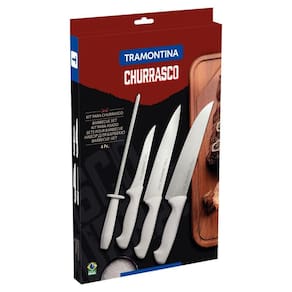 Jogo De Facas Para Churrasco Tramontina Aço Inox Polipropileno 4 Peças Todo mundo aprecia um bom churrasco, seja em família ou entre amigos, é sempre uma boa pedida. Para garantir a excelência no preparo e execução desta deliciosa tradição, a escolha certa é o jogo de facas para churrasco Tramontina em aço inox com cabo polipropileno 4 peças da linha Churrasco. As facas com lâminas em aço inox, cabos de polipropileno e chaira de aço carbono cromado você terá a certeza de um churrasco perfeito e ótimos momentos! É kit de fábrica - Sim Modelo - 24699825 Cor - Branco Quantidade de Peças - 4 Peças Material Cabo - Polipropileno Linha ou Coleção - Churrasco Quantidade de Peças - 4 Composição - 1 Chaira 8;1 Faca Utility 8;1 Faca para Cozinha 8;1 Faca para Desossar 5. Material - Aço Inox Mais Informações - As lâminas de aço inox das facas têm maior durabilidade do fio devido ao tratamento térmico.Chaira possui haste de aço carbono revestida com cromo-duro que garante uma maior durabilidade e precisão para a afiação.Os cabos de polipropileno possuem maior resistência e durabilidade.Podem ir à máquina de lavar louças facilitando seu dia a dia. Ambiente - Cozinhas Peso - 0.42 Kg do Fabricante - 3 meses para defeitos de fabricação EAN - 7891112174450