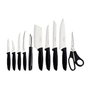 Sua cozinha ganhará maior funcionalidade e versatilidade com o jogo de facas Tramontina Plenus com lâminas em aço inox e cabos de polipropileno preto 10 peças. Com peças essencias para o preparo das suas refeições do dia a dia, como facas, cutelo, descascador e tesoura, ele vai deixar o preparo de suas receitas ainda mais fácil. As lâminas das peças são produzidas em aço inox com tratamento térmico e cabos de polipropileno, garantem alto poder de corte, resistência e maior durabilidade. Um jogo que ainda pode ser levado à máquina de louças e que vai facilitar suas tarefas, seja na hora de cozinhar ou limpar!