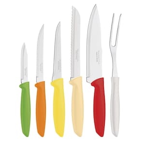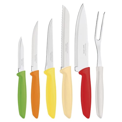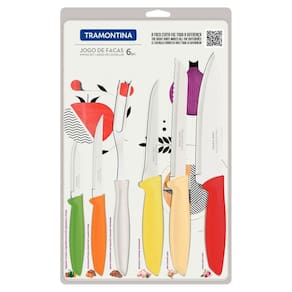 Jogo de facas plenus colorido 6 peças Leve cor, praticidade e qualidade para dentro da sua cozinha com o jogo de facas tramontina plenus com lâminas em aço inox e cabos de polipropileno colorido 06 peças Suas peças são perfeitas para uso no dia a dia, pois são produzidas com lâminas em aço inox com tratamento térmico aplicado e com cabos de polipropileno colorido, ambas características que as tornam facas resistentes, duráveis e com excelente capacidade de corte. Elas são muito práticas, fáceis de limpar e podem ser lavadas na máquina de lavar louças, otimizando muito mais sua rotina na cozinha. Com certeza, um jogo indispensável para completar sua cozinha e deixá-la muito mais bonita