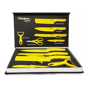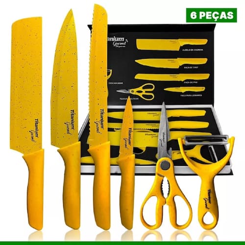 Jogo de Facas Premium Aço Inoxidável Chef Titanium Gourmet Amarelo 6 Peças