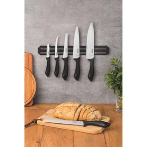 Jogo de Facas Tramontina Affilata Inox e Cabos Preto com Barra Magnética 7 Peças Sua cozinha ficará mais bonita e completa com o Jogo de Facas Tramontina Affilata com Lâminas em Aço Inox e Cabos de Polipropileno Preto com Barra Magnética 7 Peças. São seis facas para as mais variadas funções, perfeitas para atender as exigências de diferentes alimentos e receitas. As lâminas de aço inox das facas garantem maior durabilidade do fio e os cabos de polipropileno na cor preta apresentam maior resistência. Além disso, acompanha barra magnética de 38 cm que torna o visual da sua cozinha mais moderno, prático e organizado. Como utilizar o produto Antes da primeira utilização, lave bem as peças e seque-as. Produtos cortantes e perfurantes: tenha cuidado ao manusear e mantenha fora do alcance das crianças. Para maior durabilidade dos produtos recomenda-se secar bem antes de guardar, mesmo após lavagem em máquina. Recomenda-se o uso de tábuas de polipropileno ou madeira da Tramontina para maior durabilidade do fio das facas. Não é indicado o uso das facas para o corte de alimentos congelados. Mantenha sempre suas facas afiadas utilizando os afiadores da Tramontina. Para descarte dos produtos e embalagens siga as orientações de reciclagem vigentes. As lâminas de aço inox têm maior durabilidade do fio devido ao tratamento térmico. Os cabos de polipropileno possuem maior resistência e durabilidade. Podem ir à máquina de lavar louças facilitando seu dia a dia. Barra indicada para facas com lâminas de características ferro magnéticas. Acompanha parafusos e buchas para fixação. Especificação Técnica: EAN13: 7891112264908 DUN14: 17891112264905 NCM: 8211.10.00 Peso Líquido: 0,6850 kg. Peso Bruto: 0,9200 kg. Metragem: 0,004566 m³. Cor 1: 000000 Hexa Conteúdo do Jogo: 1 23654108 Faca Chef Tramontina Affilata com Lâmina em Aço Inox 1 23653105 Faca para Desossar Tramontina Affilata com Lâmina em Aço Inox 1 23650103 Faca para Legumes e Frutas Tramontina Affilata com Lâmina em Inox 1 23652108 Faca para Pão Tramontina Affilata com Lâmina em Aço Inox 1 23657105 Faca para Tomate Tramontina Affilata com Lâmina em Aço Inox 1 23655107 Faca Utility Tramontina Affilata com Lâmina em Aço Inox