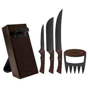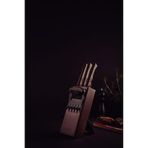 conteúdo: 01 faca para carne/butcher 10 : 38,5cm total 01 faca para carne 8 : 33,7cm total 01 faca para desossar 6 : 29,4cm 01 garra multiuso 01 suporte de madeira