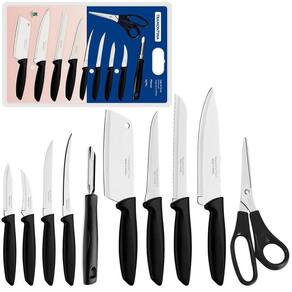 DESCRIÇÃO DO JOGO DE FACAS PLENUS TRAMONTINA 10 PEÇAS - Sua cozinha ganhará maior funcionalidade e versatilidade com o jogo de facas Tramontina Plenus com lâminas em aço inox e cabos de polipropileno preto 10 peças. - Com peças essencias para o preparo das suas refeições do dia a dia, como facas, cutelo, descascador e tesoura, ele vai deixar o preparo de suas receitas ainda mais fácil. - As lâminas das peças são produzidas em aço inox com tratamento térmico e cabos de polipropileno, garantem alto poder de corte, resistência e maior durabilidade. - Um jogo que ainda pode ser levado à máquina de louças e que vai facilitar suas tarefas, seja na hora de cozinhar ou limpar!