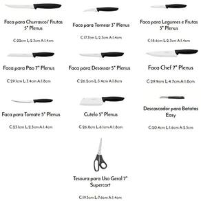 CONTEÚDO DO JOGO 1 Cutelo 5" Plenus 1 Descascador para Batatas Easy 1 Faca Chef 7" Plenus 1 Faca para Churrasco/ Frutas 5" Plenus 1 Faca para Desossar 5" Plenus 1 Faca para Legumes e Frutas 3" Plenus 1 Faca para Pão 7" Plenus 1 Faca para Tomate 5" Plenus 1 Faca para Tornear 3" Plenus 1 Tesoura para Uso Geral 7" Supercort