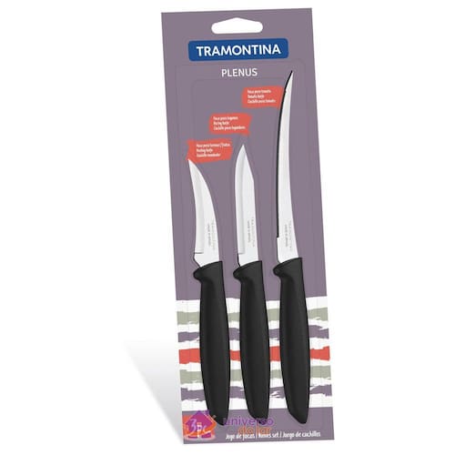 Jogo de Facas Tramontina Plenus com Lâminas em Aço Inox e Cabos de Polipropileno Preto 3 Peças Você vai encontrar versatilidade e muito charme com o Jogo de Facas para Tramontina Plenus com Lâminas em Aço Inox e Cabos de Polipropileno Preto 3 Peças da Linha Plenus. As três peças são projetadas para diferentes usos em frutas, verduras e legumes, elas participam desde momentos da hora do café da manhã ao jantar, passando pelos encontros em família até refeições rápidas. As lâminas são em aço inox e os cabos em polipropileno na cor preta, resistentes e confortáveis no manuseio. Fáceis de limpar, podem ser utilizadas na máquina de lavar louças.