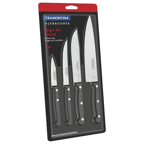 Jogo De Facas Tramontina Ultracorte Com Laminas Em Aço Inox E Cabos De Polipropileno Preto 4 Peças Jogo de Facas Tramontina Ultracorte com Lâminas em Aço Inox e Cabos de Polipropileno Preto 4 Peças Existem facas que são essenciais para o sucesso das nossas receitas. Com o Jogo de Facas Tramontina Ultracorte com Lâminas em Aço Inox e Cabos de Polipropileno Preto 4 Peças da Linha Ultracorte você vai encontrar talheres que se adaptam às diferentes funções na cozinha. As 4 peças possuem cabos em polipropileno na cor preta, confortável no manuseio e com proteção antimicrobiana, inibindo a ação de bactérias e fungos. As lâminas em aço inox são resistentes e possuem tratamento térmico, que dão maior durabilidade ao fio. Para facilitar ainda mais o dia-a-dia, as peças podem ser levadas à máquina de lavar louças.