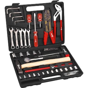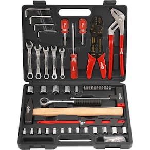 1 Jogo de ferramentas, composto por maleta plástica com 99 peças em aço carbono, sendo: 2 chaves de fenda (6 mm x 40 mm e 6 mm x 100 mm), 1 chave phillips 6 mm x 40 mm, 4 chaves allen (3 mm, 4 mm, 5 mm e 6 mm), 5 chaves combinadas (8 mm, 9 mm, 10 mm, 11 mm e 12 mm), 1 alicate multiuso, 1 alicate bomba d'água, 1 martelo pena 300 g, 1 miniarco de serra, 4 soquetes sextavados encaixe 3/8" (14 mm, 15 mm, 16 mm e 17 mm), 13 soquetes sextavados encaixe 1/4" (4 mm - 4,5 mm - 5 mm - 5,5 mm, 6 mm - 6,5 mm - 7 mm - 8 mm - 9 mm - 10 mm - 11 mm - 12 mm e 13 mm), 1 catraca, 1 chave T, 1 soquete adaptador, 11 ponteiras e 53 terminas elétricos diversos