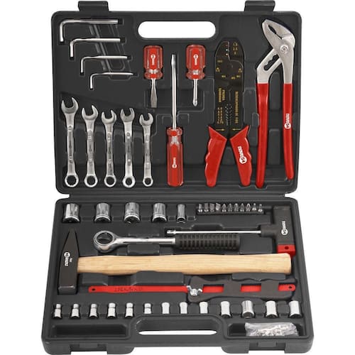 Jogo De Ferramentas Com 100 Peças E Maleta Nove54 - Kf 100 Indicado para manutenções e reparos em geral. Acompanha maleta plástica para perfeito acondicionamento das ferramentas e facilitar o transporte. 1 Jogo de ferramentas, composto por maleta plástica com 100 peças em aço carbono, sendo: 2 chaves de fenda 6 mm x 40 mm e 6 mm x 100 mm , 1 chave phillips 6 mm x 40 mm, 4 chaves allen 3 mm, 4 mm, 5 mm e 6 mm , 5 chaves combinadas 8 mm, 9 mm, 10 mm, 11 mm e 12 mm , 1 alicate multiuso, 1 alicate bomba d'água, 1 martelo pena 300 g, 1 miniarco de serra, 4 soquetes sextavados encaixe 3/8 14 mm, 15 mm, 16 mm e 17 mm , 13 soquetes sextavados encaixe 1/4 4 mm - 4,5 mm - 5 mm - 5,5 mm, 6 mm - 6,5 mm - 7 mm - 8 mm - 9 mm - 10 mm - 11 mm - 12 mm e 13 mm , 1 catraca, 1 chave T, 1 soquete adaptador, 11 ponteiras, 53 terminais elétricos diversos Quantidade de peças do jogo de ferramentas:100 peças CDC : legal: 90 dias