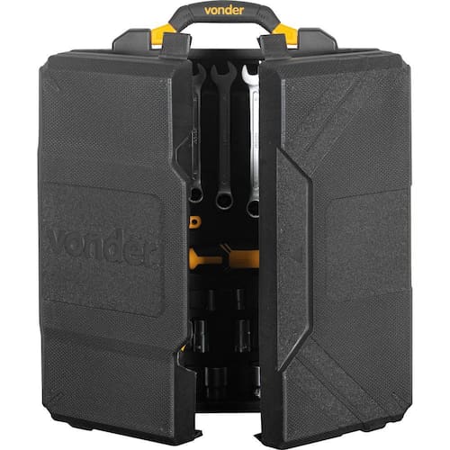 1 Jogo de ferramentas, composto por 110 peças, sendo: 1 maleta plástica, 1 porta-chaves allen/hexagonais, 4 porta-bits, 1 alicate corte diagonal 6" em aço cromo vanádio, 1 alicate de bico meia-cana 6" em aço cromo vanádio, 1 alicate bomba d'água 10" em aço cromo vanádio, 2 chaves de fenda em aço cromo vanádio (5,0 mm x 75 mm (3/16" x 3") e 6,3 mm x 100 mm (1/4" x 4")), 2 chaves phillips em aço cromo vanádio (5,0 mm x 75 mm (n 1 - 3/16" x 3") e 6,3 mm x 100 mm (n 2 - 1/4" x 4")), 8 chaves allen/hexagonais em aço cromo vanádio (1,5 mm - 2 mm - 2,5 mm - 3 mm - 4 mm - 5 mm - 5,5 mm - 6 mm), 11 chaves combinadas (8 mm - 9 mm - 10 mm - 11 mm - 12 mm - 13 mm - 14 mm - 15 mm - 17 mm - 18 mm - 19 mm), 15 soquetes sextavados encaixe 1/2" em aço cromo vanádio (10 mm - 11 mm - 12 mm - 13 mm - 14 mm - 15 mm - 17 mm - 18 mm - 19 mm - 20 mm - 21 mm - 22 mm - 23 mm - 24 mm - 27 mm), 1 catraca encaixe 1/2", 1 extensão 5" em aço cromo vanádio encaixe 1/2", 1 junta universal em aço cromo vanádio encaixe 1/2", 1 cabo T em aço cromo vanádio encaixe 1/2" x 10?, 2 soquetes para vela de ignição em aço cromo vanádio (16 mm e 21 mm), 11 soquetes sextavados em aço cromo vanádio encaixe 1/4" (4 mm - 5 mm - 6 mm - 7 mm - 8 mm - 9 mm -10 mm - 11 mm - 12 mm - 13 mm - 14 mm), 1 catraca encaixe 1/4", 1 extensão em aço cromo vanádio 2" encaixe 1/4", 1 extensão em aço cromo vanádio 4" encaixe 1/4", 1 extensão flexível 6" em aço cromo vanádio encaixe 1/4", 1 junta universal em aço cromo vanádio encaixe 1/4", 1 cabo adaptador para bits com catraca em aço cromo vanádio encaixe 1/4", bits magnéticos em aço cromo vanádio encaixe 1/4": 7 fenda (3,5 mm (2 peças), 4 mm (2 peças), 5,5 mm, 6,5 mm e 8 mm), 8 phillips (n 0, n 1, n 2 e n 3 (2 peças cada)), 6 allen (2 mm - 3 mm - 4 mm - 5 mm - 6 mm - 7 mm), 3 quadrados (S1, S2 e S3), 7 hexalobular (T10, T15, T20, T25, T27, T30 e T40), 3 pozidrive (PZ1, PZ2 e PZ3), 4 três pontas (1, 2, 3 e 4) e 2 adaptadores.