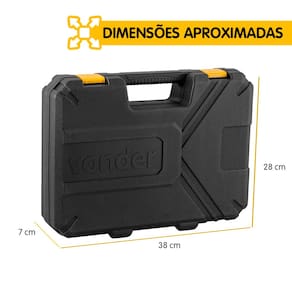 1 Jogo de ferramentas, composto por 163 peças, sendo: 1 maleta, 1 porta-chaves allen/hexagonais, 1 porta-chaves hexalobular, 4 porta-bits, 1 porta-parafusos/buchas, 11 soquetes sextavados em aço cromo vanádio encaixe 1/4" (4 mm, 5 mm, 6 mm, 7 mm, 8 mm, 9 mm, 10 mm, 11 mm, 12 mm, 13 mm e 14 mm), 6 chaves de precisão (4 fenda (1,4 mm, 2 mm, 2,4 mm, 3 mm) e 2 Phillips (PH0 e PH1)), 8 chaves allen/hexagonais em aço cromo vanádio (1,5 mm, 2 mm, 2,5 mm, 3 mm, 4 mm, 5 mm, 5,5 mm e 6 mm), 8 chaves hexalobular em aço cromo vanádio (T9, T10, T15, T20, T25, T27, T30 e T40), 4 chaves combinadas aço cromo vanádio (8 mm, 10 mm, 12 mm e 14 mm), 1 trena 3 m, 1 estilete 18 mm, 3 lâminas para estilete, 1 alicate universal 8" em aço cromo vanádio, 1 chave teste, 1 tesoura 210 mm, 1 martelo unha 20 mm, 1 régua nível, 1 fita isolante 5 m, 2 chaves de fenda em aço cromo vanádio (5 mm x 75 mm (3/16" x 3") e 6,3 mm x 100 mm (1/4" x 4")), 2 chaves phillips em aço cromo vanádio (5,0 mm x 75 mm (n°1 - 3/16" x 3") e 6,3 mm x 100 mm (n°2 - 1/4" x 4")), 1 cabo adaptador para bits com catraca encaixe 1/4", 14 parafusos autoatarraxantes (3 mm x 19 mm, cabeça chata, phillips), 10 parafusos autoatarraxantes (3,6 mm x 25 mm, cabeça chata, phillips), 7 parafusos autoatarraxantes (4 mm x 30 mm, cabeça chata, phillips), 14 buchas nylon de fixação 5 mm, 10 buchas nylon de fixação 6 mm, 7 buchas nylon de fixação 7 mm, 40 bits magnéticos em aço cromo vanádio encaixe 1/4" ((7 fenda (3,5 mm (2 peças), 4 mm (2 peças), 5,5 mm, 6,5 mm e 8 mm), 8 phillips (n° 0, n° 1, n° 2 e n° 3 (2 peças cada)), 6 allen (2 mm, 3 mm, 4 mm, 5 mm, 6 mm e 7 mm), 3 quadrados (S1, S2 e S3), 7 hexalobular (T10, T15, T20, T25, T27, T30 e T40), 3 pozidrive (PZ1, PZ2 e PZ3), 4 três pontas (1, 2, 3 e 4) e 2 adaptadores).