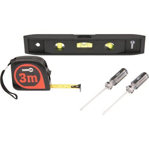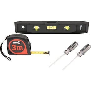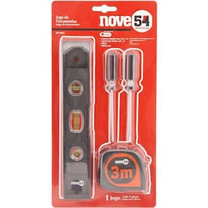 Jogo de ferramentas com 4 pecas jfn 041 954 3599000041 Conteúdo da embalagem: 1 jogo de ferramentas com 4 peças, sendo: 1 nível plástico 9, 1 chave de fenda aço carbono 1/8 x 3, 1 chave de fenda cruzada/phillips aço carbono 1/8 x 3 e 1 trena 3 m