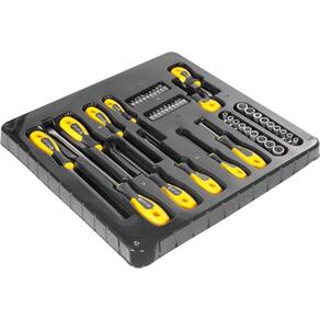 1 Jogo de ferramentas, composto por 49 peças, sendo: 5 chaves de fenda em aço cromo vanádio (1/8 x 3, 3/16 x 4, 1/4 x 1.1/2, 1 /4 x 4 e 5/16 x 8), 5 chaves phillips em aço cromo vanádio (1/8 x 3, 3/16 x 4, 1/4 x 1.1/2, 1/4 x 4 e 5/16 x 6), 19 bits em aço cromo vanádio encaixe 1/4, sendo, 5 fenda (3 mm, 4 mm, 5 mm, 6 mm e 7 mm), 4 phillips (PH0, PH1, PH2 e PH3), 4 pozidrive (PZ0, PZ1, PZ2 e PZ3) e 6 hexalobular (T10, T15, T20, T25, T27 e T30), 1 adaptador de encaixe quadrado para sextavado, 1 cabo adaptador de bits sextavado 1/4, 9 soquetes sextavados em cromo vanádio encaixe 1/4 (3/16, 1/4, 9/32, 5/16, 11/32, 3/8, 7/16, 15/32 e 1/2), 9 soquetes sextavados em aço cromo vanádio encaixe 1/4 (5 mm, 6 mm, 7 mm, 8 mm, 9 mm, 10 mm, 11 mm, 12 mm e 13 mm)