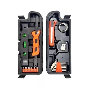 Este jogo abrange uma ampla variedade de ferramentas necessárias para uso doméstico em reparos, montagens de móveis e outras tarefas. A trena curta possui uma caixa plástica resistente, uma fita de 3 metros por 12 mm com mecanismo de fixação para maior conforto durante o trabalho. Além disso, a fita métrica possui uma escala milimétrica e duas classes de precisão, garantindo medidas mais precisas, e uma bobina reforçada para maior durabilidade.