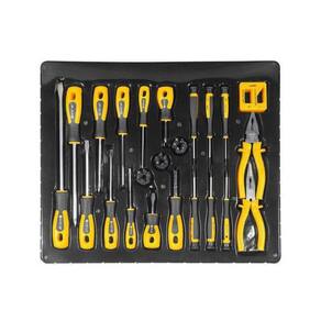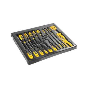 Jogo de ferramentas, composto por: 5 x chaves de fenda em aço cromo vanádio: 1/8 x 3, 3/16 x 4, 1/4 x 1.1/2, 1 /4 x 4 e 5/16 x 8 5 x chaves phillips em aço cromo vanádio: 1/8 x 3, 3/16 x 4, 1/4 x 1.1/2, 1/4 x 4 e 5/16 x 6 4 x bits fenda em aço cromo vanádio encaixe 1/4: 3mm, 4mm, 5mm e 6mm 4 x bits phillips em aço cromo vanádio encaixe 1/4: ph0, ph1, ph2 e ph3 4 x bits pozidrive em aço cromo vanádio encaixe 1/4: pz0, pz1, pz2 e pz3 6 x bits hexalobular em aço cromo vanádio encaixe 1/4: t10, t15, t20, t25, t27 e t30 3 x chaves de fenda: 2mm, 2,4mm e 3mm 3 x chaves phillips: 2mm, 2,4mm e 3mm) 1 x desmagnetizador / magnetizador 1 x cabo adaptador de bits encaixe sextavado 1/4 1 x alicate de bico meia cana reto com isolação 1.000v 1 x alicate universal 6pol. Com isolação 1.000v