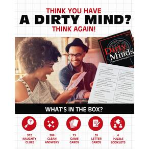 TDC Games Jogo de festa autêntico Dirty Minds - Jogos de cartas engraçados para adultos, divertidos jogos de festa, perfeitos para casais e encontros noturnos - Mentes sujas: o jogo sujo mais limpo do mundo. O conjunto inclui 912 pistas impertinentes, 304 respostas limpas, 4 livretos de quebra-cabeça, 35 cartas de letras e 15 cartas de jogo. - Em movimento. Leve este conjunto embalado com você onde quer que você vá para liberar a sujeira e manter as risadas por horas em qualquer festa ou reunião. Certifique-se de levá-lo para sua próxima despedida de solteiro ou despedida de solteira e prepare-se para ver onde os pensamentos das pessoas viajam. - Jogo de festa: brinque com amigos ou familiares e veja como pistas altamente sugestivas levarão às respostas mais inocentes, apenas para descobrir quanta sujeira está em sua cabeça. Tire sua mente da sarjeta para ser o vencedor deste jogo e colete todas as cartas de cinco letras para soletrar sujeira. O presente perfeito para todas as mentes sujas da sua vida. - Alta qualidade: Inclui caixa de papelão resistente de 16,5 x 19,8 x 9,9 cm para armazenar cartas de baralho de papel grosso. Cartas flexíveis D-I-R-T-Y vêm em folhas dobráveis para garantir fácil armazenamento. - TDC GAMES: Fazendo os jogos de festa mais extravagantes do mundo e quebra-cabeças excepcionais desde 1984. Nossos jogos são novos e criativos com um toque de humor. A TDC Games foi homenageada com muitos prêmios, incluindo os seguintes: o Fat Brain Award, o selo de aprovação do National Parenting Center e o prêmio Tilliwig de melhor diversão em família.