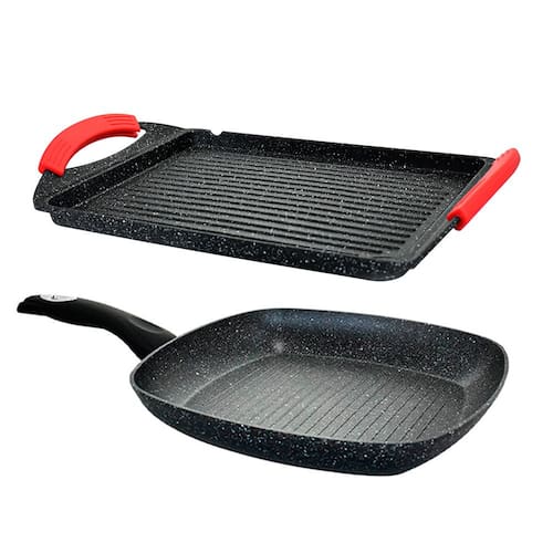 Composição: 1 Frigideira de 28cm de comprimento x 28cm de largura x 4cm de altura Capacidade: 2L 1 Chapa de 34cm de comprimento x 26cm de largura x 2cm de altura Peso Aproximado: 1,25kg