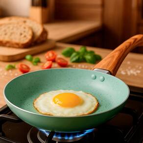 Com visual moderno e delicado, o tom verde das frigideiras traz leveza ao ambiente, enquanto os cabos com acabamento amadeirado evocam a beleza natural.