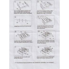 Itens: 01 manual de instruções para montagem 04 barras com 03 jogadores 27 partes/peças para a montagem da mesa 16 parafusos 01 chave allen 02 bolinhas