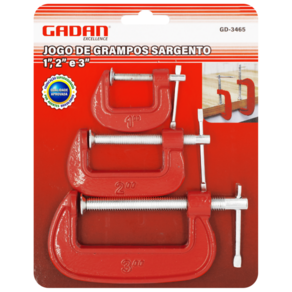 É essencial termos algumas ferramentas básicas em nossa casa, e com esse kit de grampo você estará preparado para qualquer imprevisto do dia a dia. Destinado principalmente para trabalhos leves, como: trabalhos manuais, marcenaria, carpintaria e uso doméstico. Você pode usá-lo para imobilizar, fixar ou segurar objetos diversos, seja em superfícies planas, bancadas e outros. Kit Grampo Sargento Com 3 Peças. O Jogo de Grampos tipo C com de 3 peças nos tamanhos 1'', 2'' e 3'' Polegadas, possui acabamento pintado, proporcionando resistência a oxidação, corrosão, resistência e eficácia no uso.