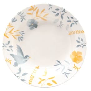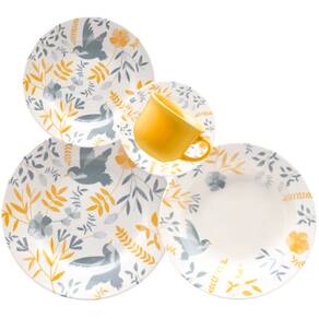 O canto dos pássaros nunca esteve tão presente na sua mesa. A Biona veio para dar cor e som a sua mesa posta. Cores lindas e delicadas para acompanhar você em sua refeição. é a decoração que representa a fauna e flora do Brasil nos pratos da coleção. Em tons de amarelo e azul claro, ramos, flores e o delicado passarinho Bem-te-vi decoram cada peça. A xícara da coleção é toda esmaltada em amarelo, trazendo um ponto de cor em destaque no aparelho de jantar.