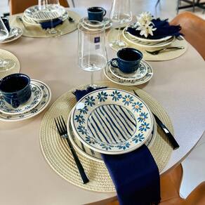 • Dimensões: Prato Raso Ø 26x3,5cm | Prato Fundo Ø 21,5x4cm | Prato Sobremesa Ø 18x2cm | Xícara Ø 9x8cm | Pires Ø 14x2cm