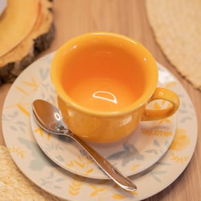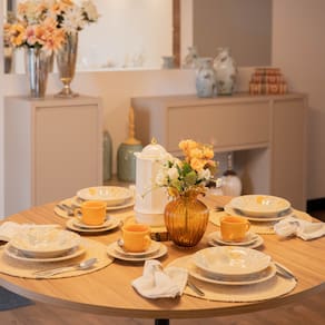 • Dimensões: Prato Raso Ø 26x3,5cm | Prato Fundo Ø 21,5x4cm | Prato Sobremesa Ø 18x2cm | Xícara Ø 9x8cm | Pires Ø 14x2cm