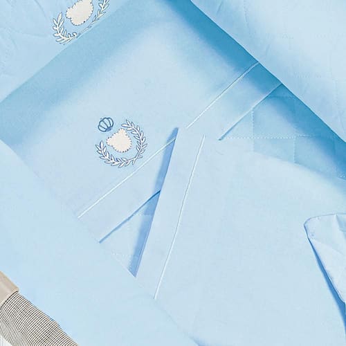 Jogo De Lençol Berço Desmontável 3 Peças Small Urso Azul Conheça agora nosso Jogo de Lençol para Berço Desmontável Camping ou Chiqueirinho com 3 Peças, possuindo um bordado para que dê um charme elegante. Composição: 100% Algodão. Itens inclusos: Small: - Lençol de cima 1,20m x 85cm. - Lençol com elástico 1,08m x 80cm x 5cm. - Fronha 38cm x 28cm.