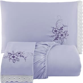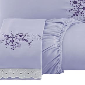 1 Lençol com elástico: Com estampa floral bordada e renda delicada, se adapta perfeitamente a colchões de até 30cm de altura. 2 Porta-travesseiros: Com o mesmo design do lençol, os porta-travesseiros complementam o conjunto com perfeição.