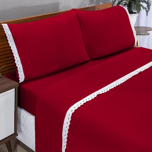 Jg De Lençol Casal King Microfibra com Lese 04 Peças - Vermelho CONTÉM: 01 Lençol com elástico 2,10 X 1,98 X 3001 Lençol de cima sem elástico com detalhe em Lese 2,70 X 2,5002 Fronhas com detalhe em Lese 70 x 50 COMPOSIÇÃO:Tecido Microfibra 100% Poliéster ORIENTAÇÕES DE CUIDADOS:-não utilizar produtos alvejantes base de cloro água sanitária, água de lavadeira, entre outros ;-faça enxágue final abundante para retirar todo o excesso de sabão e amaciante, evitando que a peça fique esbranquiçada;-tons críticos e cores fortes desbotam com mais facilidade evite exposição prolongada ao sol ;-colocar sal no último enxágue em peças escuras evita que solte tinta e manche .