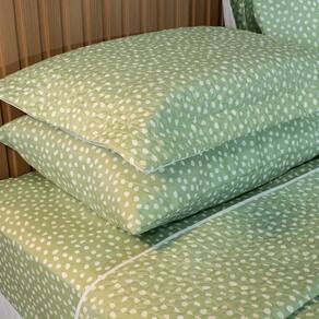 O conjunto inclui um lençol de baixo com estampa, adequado para colchões de casal padrão, com dimensões de 1,38 metros de largura, 1,88 metros de comprimento e 30 centímetros de altura. O elástico garante um ajuste seguro ao colchão.