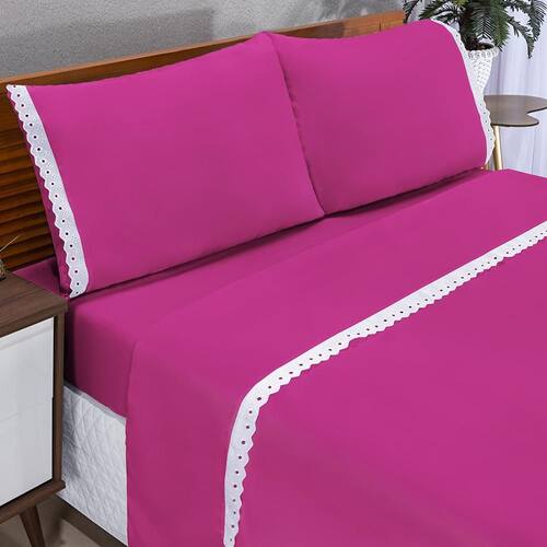 Jg De Lençol Casal Queen Microfibra com Lese 04 Peças - Pink CONTÉM: 01 Lençol com elástico 2,10 X 1,58 X 3001 Lençol de cima sem elástico com detalhe em Lese 2,50 X 2,4002 Fronhas com detalhe em Lese 70 x 50 COMPOSIÇÃO:Tecido Microfibra 100% Poliéster ORIENTAÇÕES DE CUIDADOS:-não utilizar produtos alvejantes base de cloro água sanitária, água de lavadeira, entre outros ;-faça enxágue final abundante para retirar todo o excesso de sabão e amaciante, evitando que a peça fique esbranquiçada;-tons críticos e cores fortes desbotam com mais facilidade evite exposição prolongada ao sol ;-colocar sal no último enxágue em peças escuras evita que solte tinta e manche .