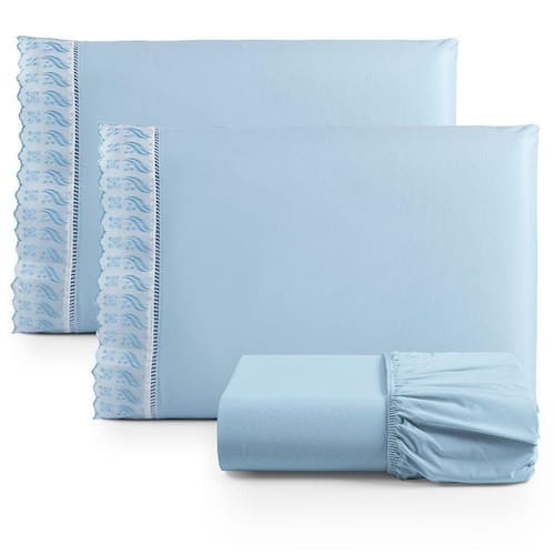 Além disso, o lençol apresenta um barrado de lese que acrescenta um toque de sofisticação e charme à sua cama. O barrado de lese, com seus delicados desenhos e detalhes rendados, eleva o design do lençol, transformando-o em uma peça única que reflete o bom gosto e a atenção aos detalhes.
