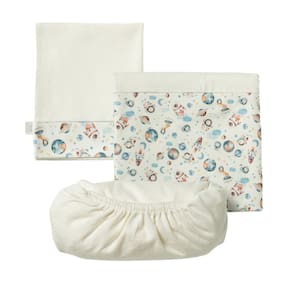 O jogo de lençol 03 peças Hug traz conforto e cuidado para o quartinho do bebê. O kit possui um lençol de elástico, uma fronha e um sobre lençol com vira em suedine estampado. Além disso, o sobre lençol é ótimo para cobrir o bebê. Indicado para berço padrão americano. Diferenciais: Suedine e meia malha com nanotecnologia que agrega maciez e tratamento antibacteriano e antifúngico; Estampa rotativa exclusiva Hug. MEDIDAS: Lençol de elástico: 70cm x 130cm x 14cm Fronha: 40cm x 30cm Sobre lençol: 98cm x 170cm. CARACTERÍSTICAS: Meia malha 100% algodão;