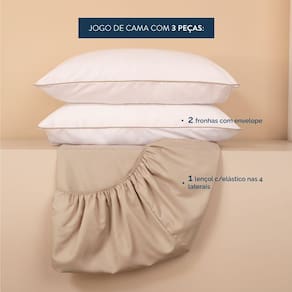 O kit conta com fronha e sobre lençol na cor branca. A fronha possui fechamento em envelope, o que facilita a retirada para lavagem. O jogo também acompanha um lençol com elástico nas 04 laterais.