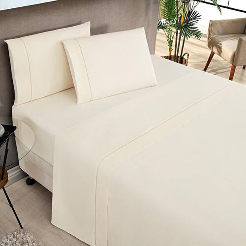 Jogo de lençol moscou queen ponto palito 4 peças Utilizamos matérias-prima de excelente qualidade que resistem à processo de lavagem, mantendo a beleza e durabilidade do produto. Contém na embalagem: 01 lençol de cima: 2,60m x 2,40m 01 lençol de baixo com elástico p/ colchão 1,98m x 1,58cm x 30 altura 02 fronhas 70cm x 50cm Composição: 80% algodão - 20% poliéster Atenção: a foto apresentada no anuncio pertence ao nosso atelier, é a foto do produto cuidado com as falsificações As cores podem mudar de acordo com o monitor. fique atento à descrição do produto. Marca: Não Informado