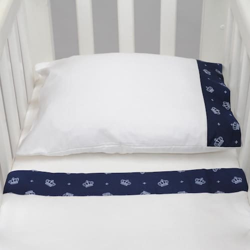 Jogo de Lençol para Mini Berço 3 Peças Coroa Azul Marinho Conheça agora nosso jogo de lençol para MINI BERÇO com 3 peças! Fabricado no tecido de 100% algodão para que tenha maior conforto! Indicado para mini berço com o colchão de aproximadamente 90cm x 58 cm. Detalhes doLençol de baixo com elástico 58cm x 84cm x 8cm Lençol de cima 1,00m x 75cm Fronha 40cm x 30cm Composição: - Tecido: 100% Algodão
