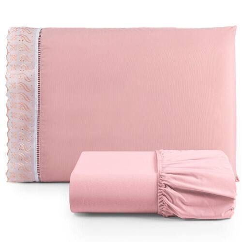 Jogo De Lençol Solteiro 2 Pçs Basic Percal 180 Fios Lese Bordado Inglês - Rosa