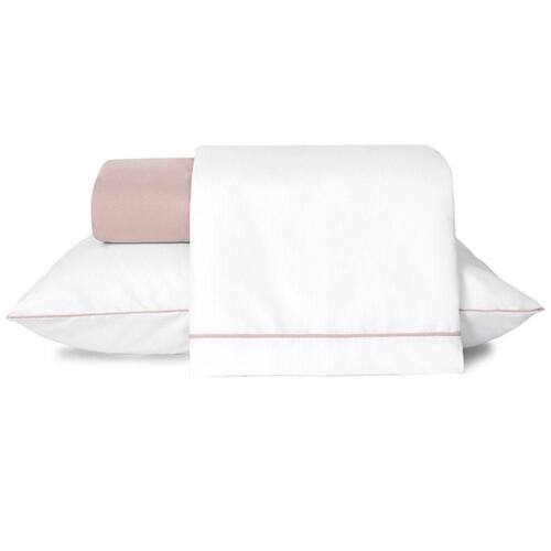 O kit conta com fronha e sobre lençol na cor branca. A fronha possui fechamento em envelope, o que facilita a retirada para lavagem. O jogo também acompanha um lençol com elástico nas 04 laterais.