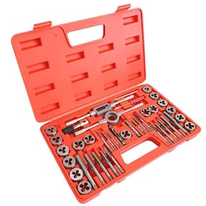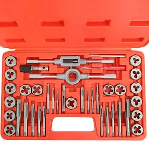 Kit com 40 peças de machos e tarrachas 00054 charbs. Completo e perfeito para criar novas roscas ou reparar roscas danificadas na maioria dos metais, como aço carbono, ferro fundido, alumínio, latão, cobre e aço inoxidável, plástico, etc.