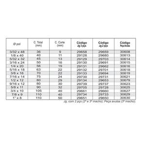 ESPECIFICAÇÕES DO MACHO MANUALDiâmetro (pol): 3/16 x 24