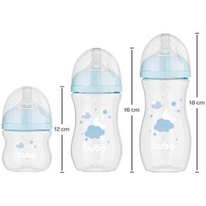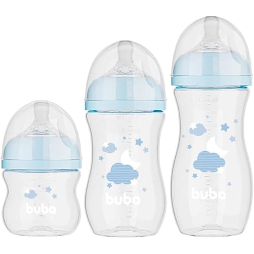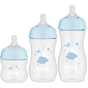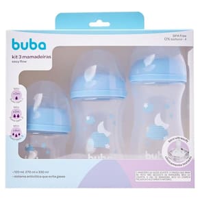 O kit inclui 3 mamadeiras com capacidade de 120ml, 270ml e 330ml e bicos fluxo tamanhos 1,2 e 3.