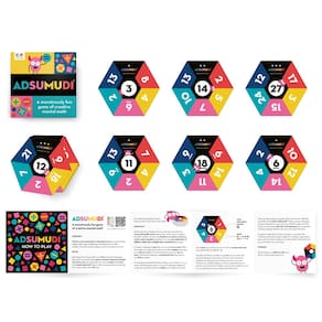 Você consegue descobrir como Adsumudi recebeu esse nome? Dica: tem a ver com adição, subtração, multiplicação e divisão. E é exatamente assim que você joga! Encontre o caminho matemático secreto para a resposta de Adsumudi em cada cartão adicionando, subtraindo, multiplicando e dividindo os outros cinco números. Existem várias maneiras de jogar Adsumudi para acomodar diferentes níveis ou simplesmente para manter as coisas interessantes! Comece no modo fácil, que exige que os jogadores usem apenas 2 números para igualar a resposta de Adsumudi, e vá até o modo médio (3 números) e o modo difícil (4 números) até o modo monstruosamente difícil, onde os jogadores precisam usar todos os 5 números para igualar a resposta de Adsumudi! Por exemplo, digamos que a resposta de Adsumudi seja 6 e os outros cinco números em um cartão sejam 1, 2, 3, 4 e 5. Se você estiver jogando no modo fácil, sua solução pode ser 2 + 4 = 6. No modo médio, você poderia dizer (4 x 3) ÷ 2 = 6. No modo difícil, você pode usar 4 + (3 - 2) + 1 = 6. Ou se você estiver jogando no modo extremamente difícil, sua solução pode ser (2 x 5 x 3) ÷ (1 + 4) = 6. Desafie seus amigos correndo para ver quem consegue encontrar a solução mais rapidamente. Guarde as cartas que você descobrir primeiro e colete 5 para ganhar! Ou trabalhe de forma colaborativa para resolver desde o modo fácil até o monstruosamente difícil para cada cartão. Os números só podem ser s uma vez em uma determinada equação, mas os jogadores podem usar qualquer combinação de adição, subtração, multiplicação e divisão que precisarem. Cada carta tem pelo menos uma solução para cada nível (fácil, médio, difícil, monstruosamente difícil), mas geralmente há várias maneiras de encontrar a resposta de Adsumudi em um determinado nível. Dos criadores do Proof! Jogo de matemática, Adsumudi certamente será o favorito entre professores de matemática e pais, perfeito para noites de jogos em família e em sala de aula, incluindo ensino remoto e ensino doméstico.