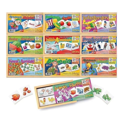 Descrição cada jogo: Uso: a criança espalhará o jogo sobre a mesa com as figuras viradas para cima. Numa etapa inicial, procurará os pares classificando-os. Em etapa avançada, poderá voltar as figuras viradas para baixo que são pinçadas uma a uma formando os pares. Ótimo estímulo e entretenimento para trabalho em grupo ou individual. Desenvolve: atenção, concentração, memorização imediata, percepção dos detalhes, organização espacial. Idade: a partir dos 4 anos. Composição: jogos de memória educativos, selecionados dentre os temas mais importantes na educação atual impressos em transfer brilhantes em fibro madeira. Acondicionados em caixa de madeira medindo 3,5x12x22cm. Contendo 40 peças medindo 5 x 5 x 0,4 cm.