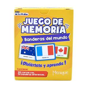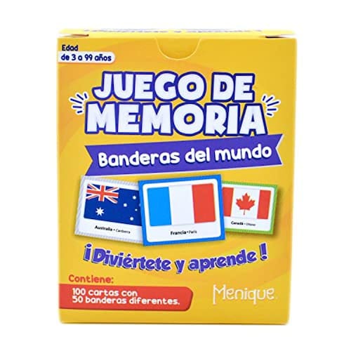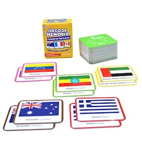 Incrível jogo de cartão de memória para crianças e adultos, jogo de cartas laminadas durável com 100 cartões com 50 pares correspondentes de diferentes bandeiras do mundo. Este jogo de cartas de correspondência é muito divertido e, ao mesmo tempo, ajuda crianças e adultos a desenvolver e melhorar suas habilidades de memória, habilidades perceptivas visuais, habilidades de compreensão e habilidades cognitivas. Divirta-se aprendendo os continentes, países, capitais e bandeiras do mundo. É ótimo para falantes de espanhol ou estudantes de espanhol. Colete os pares mais correspondentes para ganhar! O jogo perfeito para passar tempo de qualidade com a família e amigos. Ótimo para uma agradável atividade interna em um dia chuvoso. A caixa de tamanho: 3,15 x 2,55 polegadas (8 x 6,5 cm.) torna este divertido jogo perfeito para viagens ou atividades externas também. Divirta-se muito com sua família enquanto aprende!