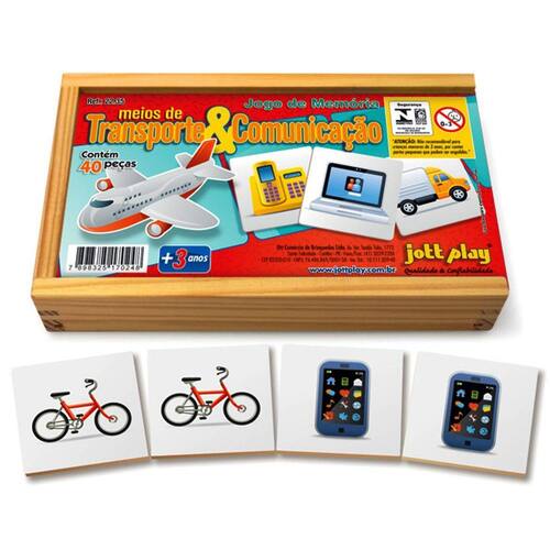 Brinquedos que ensinam, educam e divertem Jogo de memória meios de transportes e comunicação Uso: a criança espalhará o jogo sobre a mesa com as figuras viradas para cima. Numa etapa inicial, procurará os pares classificando-os. Em etapa avançada, poderá voltar as figuras viradas para baixo que são pinçadas uma a uma formando os pares. Ótimo estímulo e entretenimento para trabalho em grupo ou individual. Desenvolve: atenção, concentração, memorização imediata, percepção dos detalhes, organização espacial. Composição: jogos de memória educativos, selecionados dentre os temas mais importantes na educação atual impressos em transfer brilhantes em fibro madeira. Acondicionados em caixa de madeira medindo 3,5x12x22cm. INMETRO CE-BRI/003N 3107-07 NM300/2002 Contendo 40 peças em madeira. Certificado inmetro.