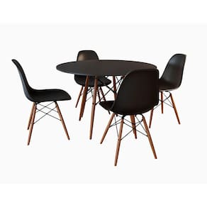 Jogo De Mesa 4 Cadeiras Pretas Eames Eiffel 90 Cm Base Madeira Tampo PretoNo quesito decoração o Jogo de Mesa 4 Cadeiras Eiffel se destaca pelo design moderno e sofisticado. A Cadeira Eiffel É confeccionada em policarbonato, sua base É em Madeira maciça, o que confere total resistência e conforto, o tampo É confeccionado em MDF com pintura impermeÁvel garantindo melhor durabilidade ao produto, sua base É em Madeira maciça. O Jogo de Mesa 4 Cadeiras Eiffel da vida ao ambiente alÉm de combinar com todos os tipos e cores de mÓveis.Dimensões:Cadeira:Altura: 80,5 cmLargura: 46,5 cmProfundidade: 42 cmAssento x Ch ão: 46 cmContÉm: 04 cadeirasPeso mÁximo suportado: 120 KgMesa:Altura: 73 cmDiâmetro: 90 cmObs: Imagens Meramente Ilustrativas